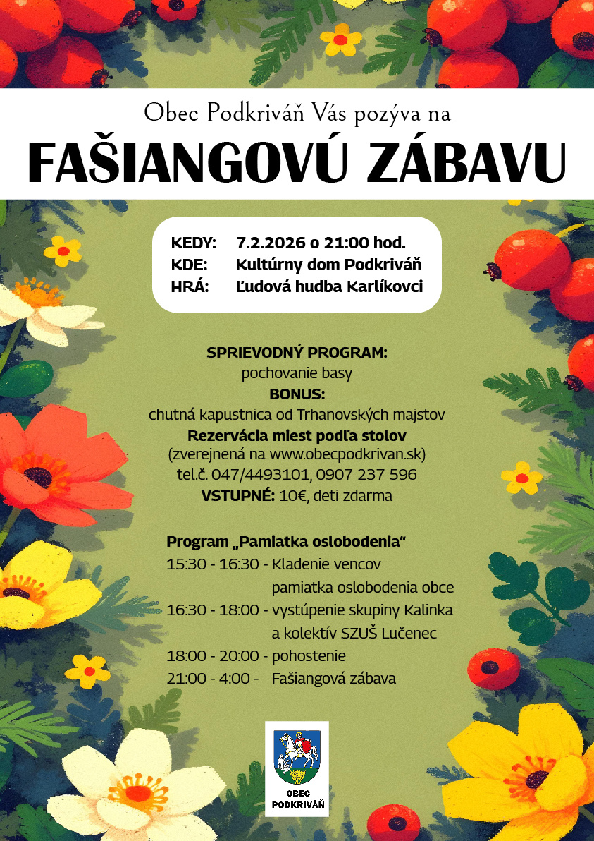 Pozvánka na Fašiangovú zábavu v Podkriváni